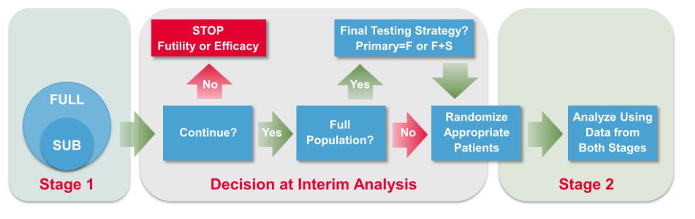 The proposed adaptive procedure fulfills the regulatory requirements for the analysis of adaptive trials as it strongly controls the prespecified multiple Type I error rate (strong control of familywise error rate).