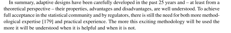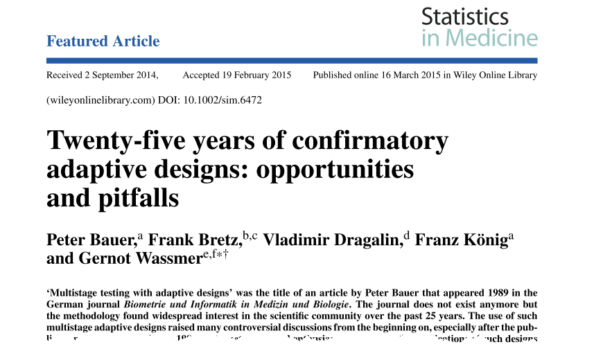Twenty-five years of confirmatory adaptive designs: opportunities and pitfalls P. Bauer, F. Bretz, V. Dragalin, F. König, and G. Wassmer. Featured Article in Statistics in Medicine 35, 325-347, 2016. http://dx.doi.org/10.1002/sim.6472 (Open Access)